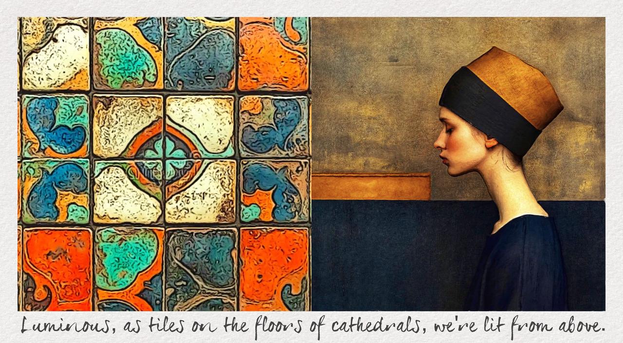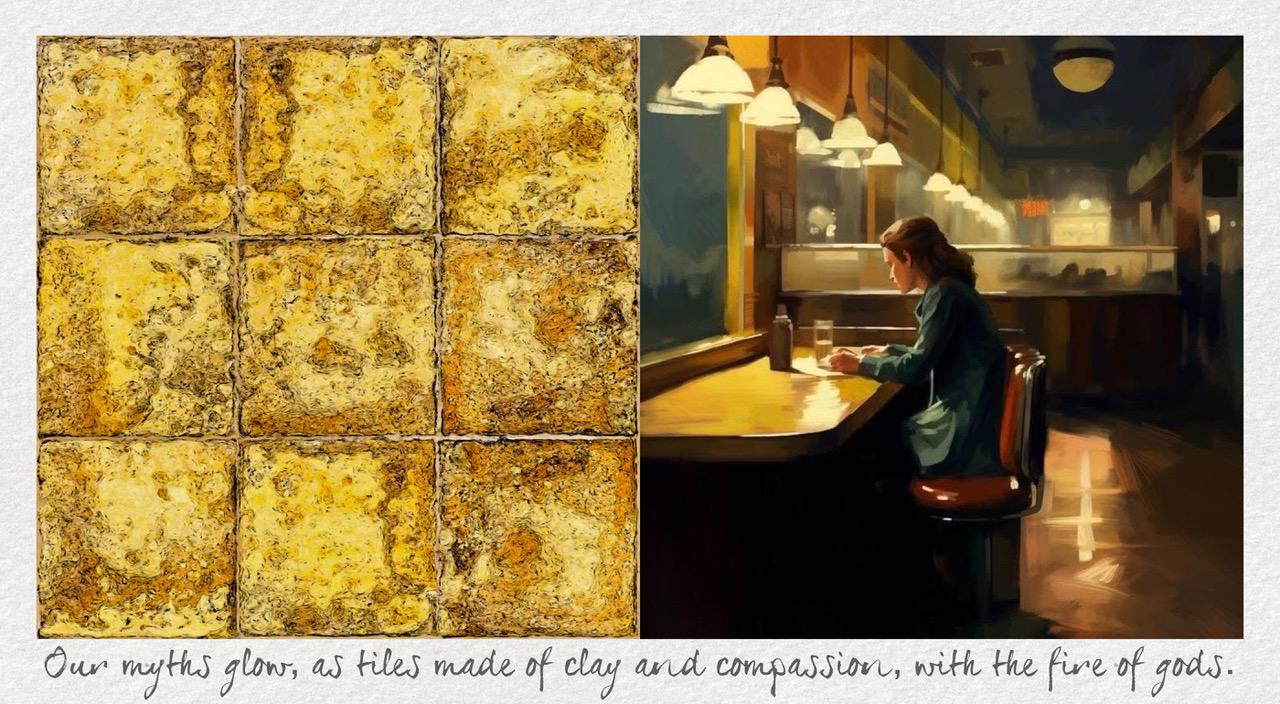 Our myths glow, as tiles made of clay and compassion, with the fire of gods.